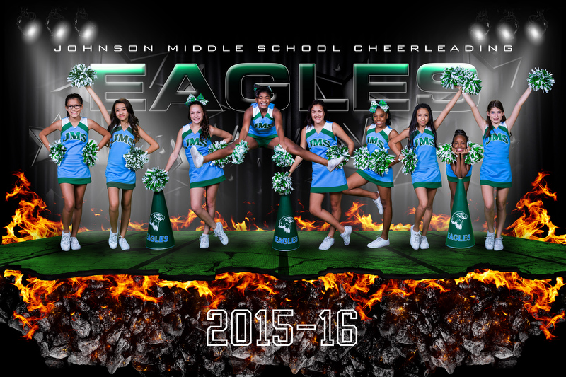 We can also be very creative with the regular team photos by shoot the team members on green screen then putting them on a creative background like the team photo below. You decide how you want the girls in each row to pose, then we just shoot them each separately then composite the team photo into this unique, creative look! The backgound will be color matched to your school colors!