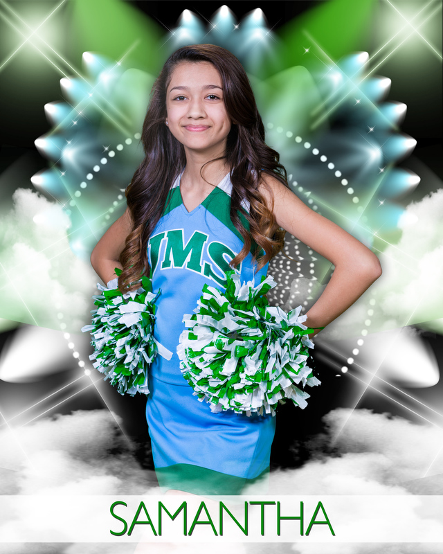 We can also be very creative with the regular team photos by shoot the team members on green screen then putting them on a creative background like the team photo below. You decide how you want the girls in each row to pose, then we just shoot them each separately then composite the team photo into this unique, creative look! The backgound will be color matched to your school colors!